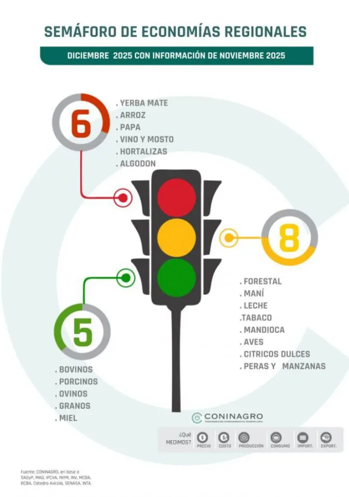 El semáforo no solo sirve como foto mensual, sino también como herramienta histórica. En más de diez años de medición, 8 de las 19 economías regionales pasaron más de la mitad del tiempo en rojo. La vitivinicultura y los cítricos dulces lideran ese ranking negativo, seguidos por lechería y arroz. En cambio, las carnes y el complejo granario mostraron un recorrido más estable, permaneciendo en verde en más del 45 % del período.