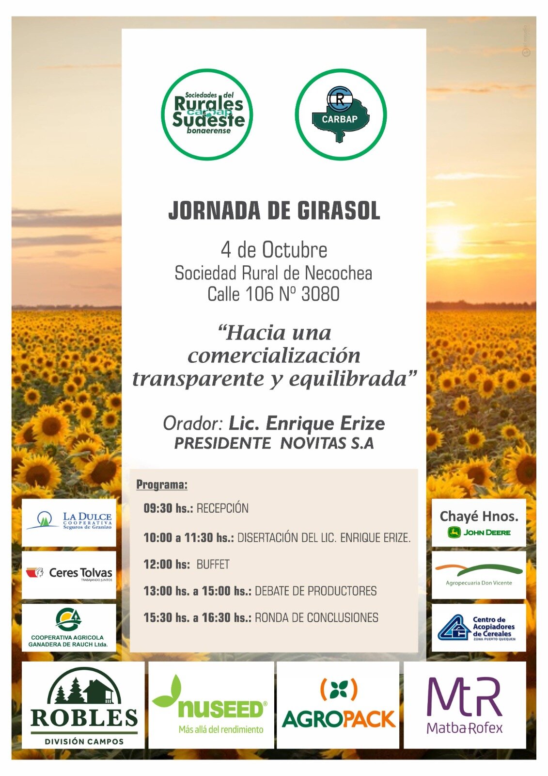 El 4 de octubre, los invitamos a un conversatorio sobre *girasol*. Le proponemos a los productores del Sudeste reflexionar: ¿es correcto el precio que recibe el productor? Agendemos la fecha. Especialistas muy reconocidos sobre el mercado serán parte de una jornada muy interesante para interiorizarse e involucrarse en un tema central: lo que recibe el productor por su esfuerzo en un cultivo emblemático para el sudeste bonaerense.